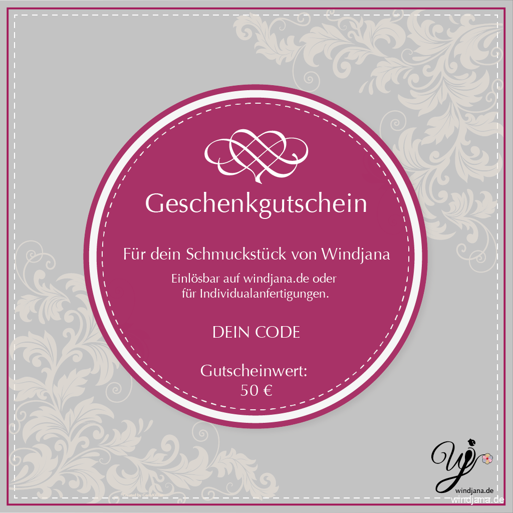 Geschenkgutschein im Wert von 50€. Der Schmuck-Gutschein ist einlösbar in Windjanas Schmuck-Shop oder für eine Individualanfertigung nach deinen Wünschen ♥️